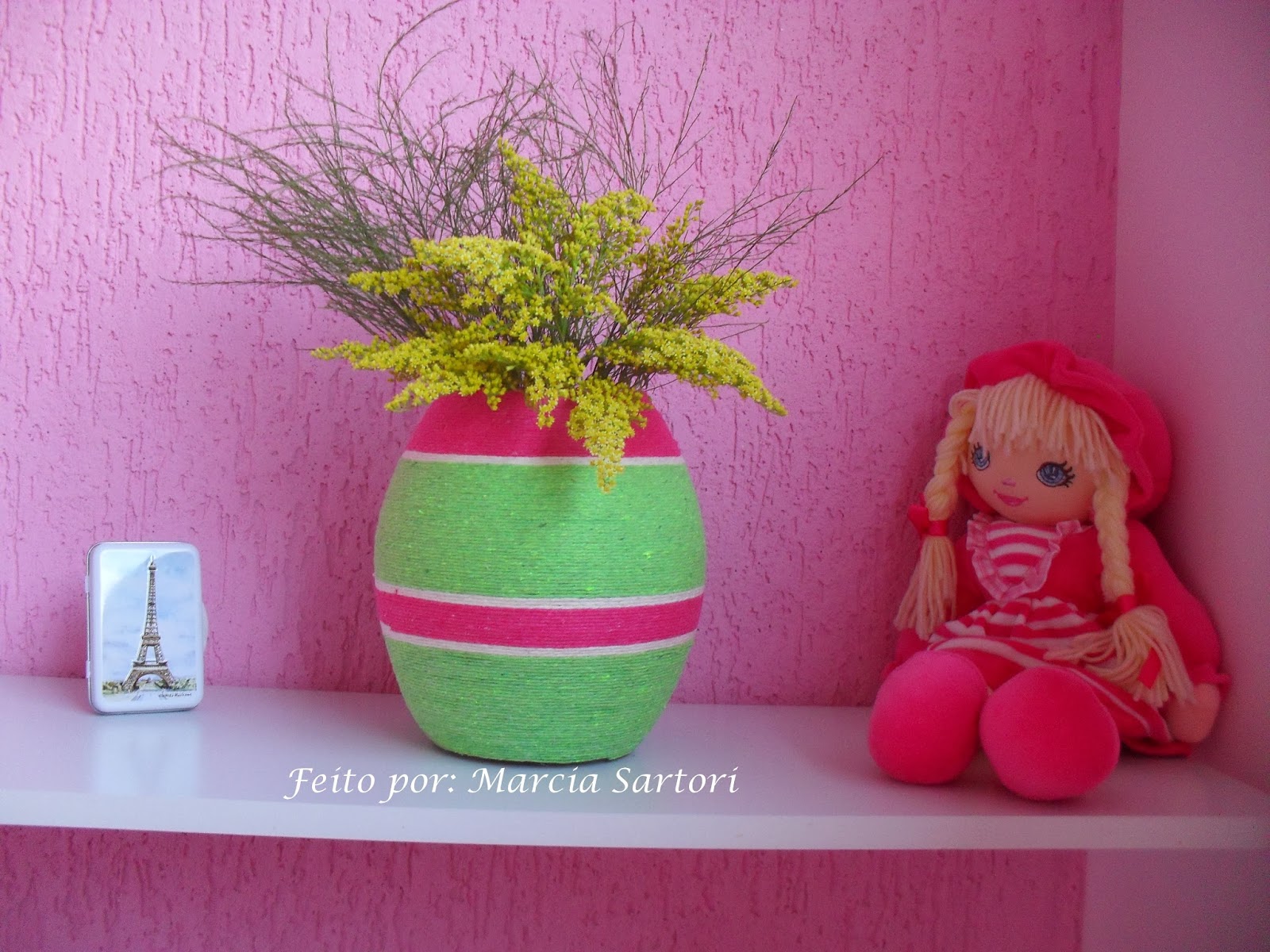 Passei a tarde de ontem fazendo uns mimos para meu ateliê, adoro fazer esses vasinhos revestidos de barbante! Olhem que visual legal que fica, e com umas florzinhas então dão todo o charme não acham?